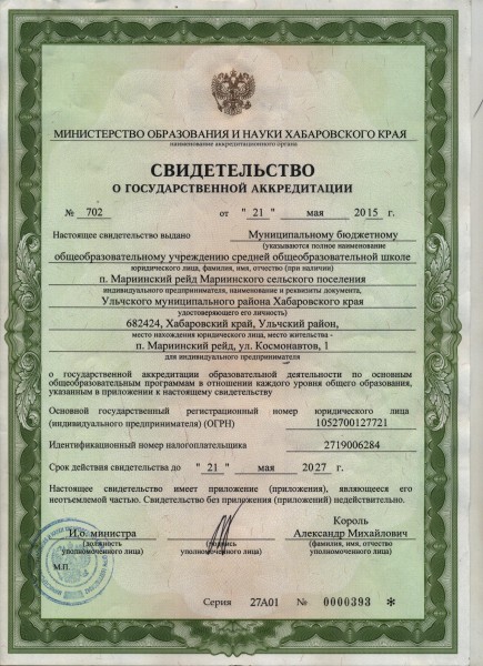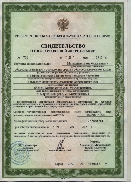 | Адрес местонахождения образовательной организации* | 682423 Хабаровский край Ульчский район с.Мариинское, ул.Партизанская, д.19а |