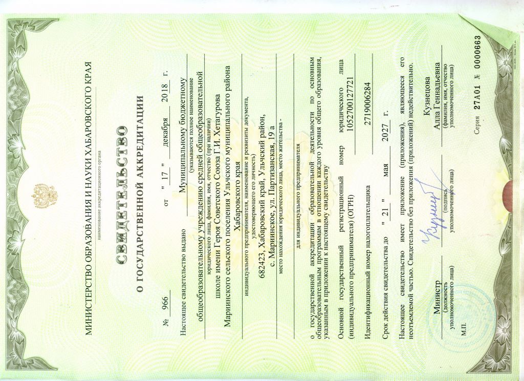 | Полное наименование образовательной организации* | Муниципальное бюджетное общеобразовательное учреждение средняя общеобразовательная школа имени Героя Советского Союза Г.И.Хетагурова Мариинского сельского поселения Ульчского муниципального района Хабаровского края |